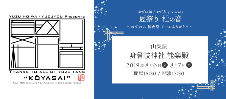 2019年8月6日(火)・7日(水)の2日間、山梨県・身曾岐神社 能楽殿にて、ゆずの輪/ゆず友 presents「夏祭り 杜の音~ゆずのみ 後夜祭 ドームありがとう~」の開催が決定!
