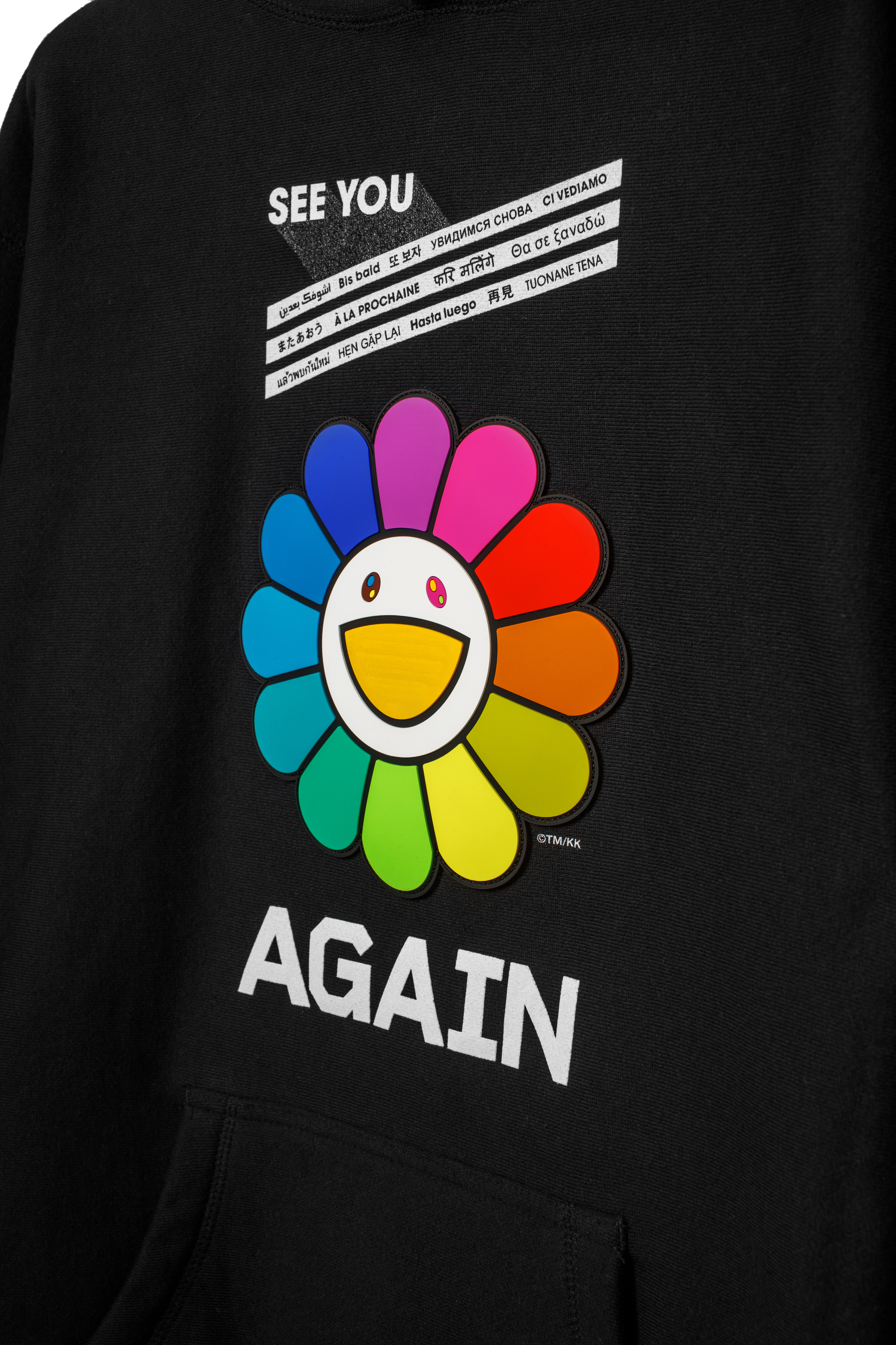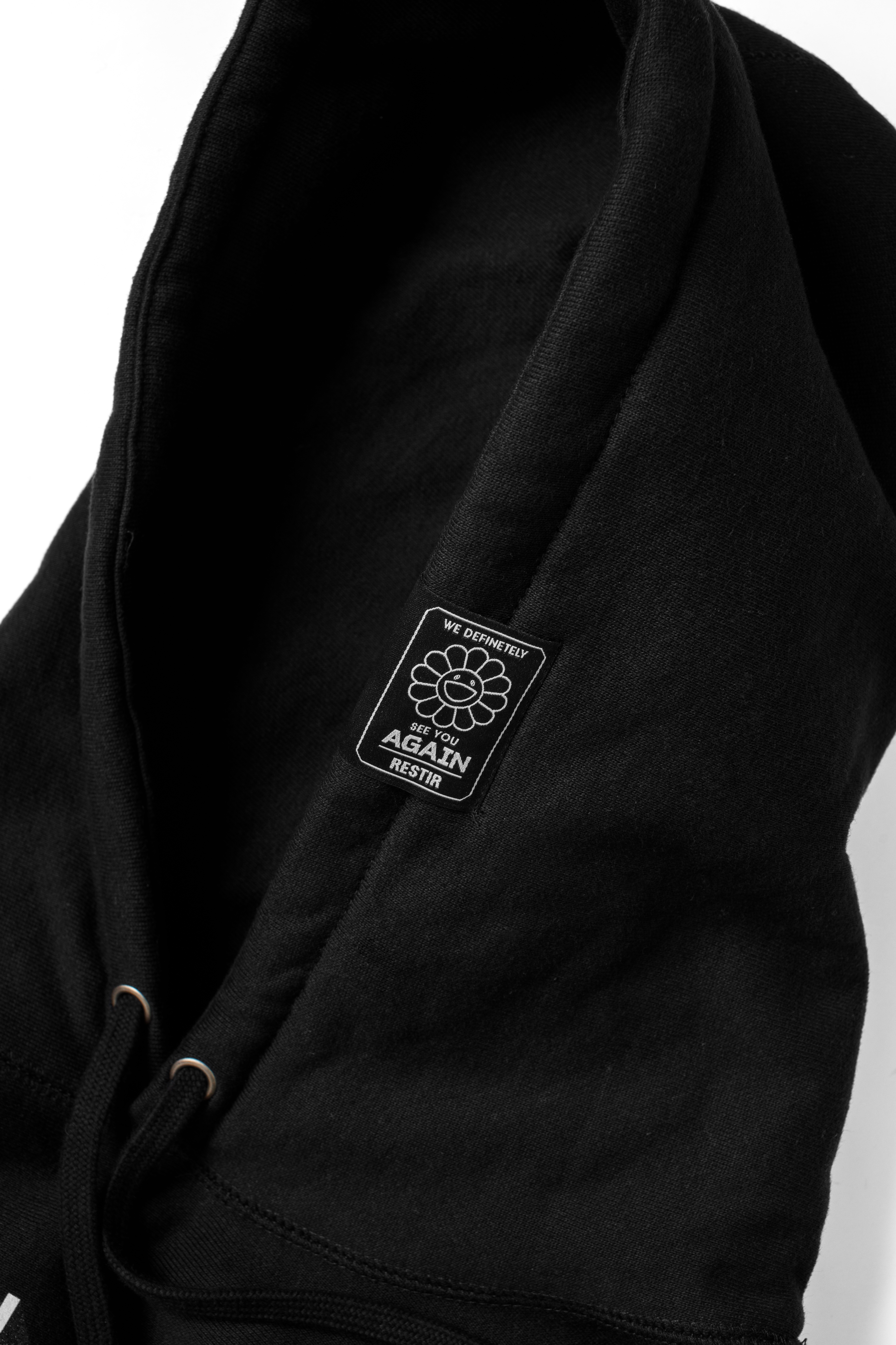 新たに販売される「Takashi Murakami×YUZU Rainbow Flower Hoodie by RESTIR」は、以前のフーディからデザイン・クオリティ共にアップグレードし、RESTIRのブランドカラーであるブラックで生まれ変わったリミテッド・エディション。フロントには厚みのあるラバー・パッチが施され、村上氏のシグネチャーである「Rainbow Flower」を立体的に表現。また、スリーブには「SEE YOU AGAIN」ラバーパッチ、そしてフードにはフラワーのネームタグを採用した、プレミアムな一着です。