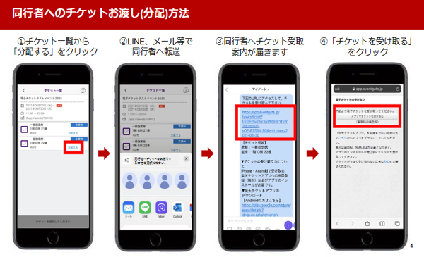 ※2枚購入され、同行者へ事前にお渡しされる場合は対象のチケットの「分配する」をタップしていただき、メール等で受取URLの通知を行ってください。(受け取りURLの有効期限は分配手続き後3日間(23時59分迄)となりますので期間内に、必ず受け取り手続きを行ってください。)