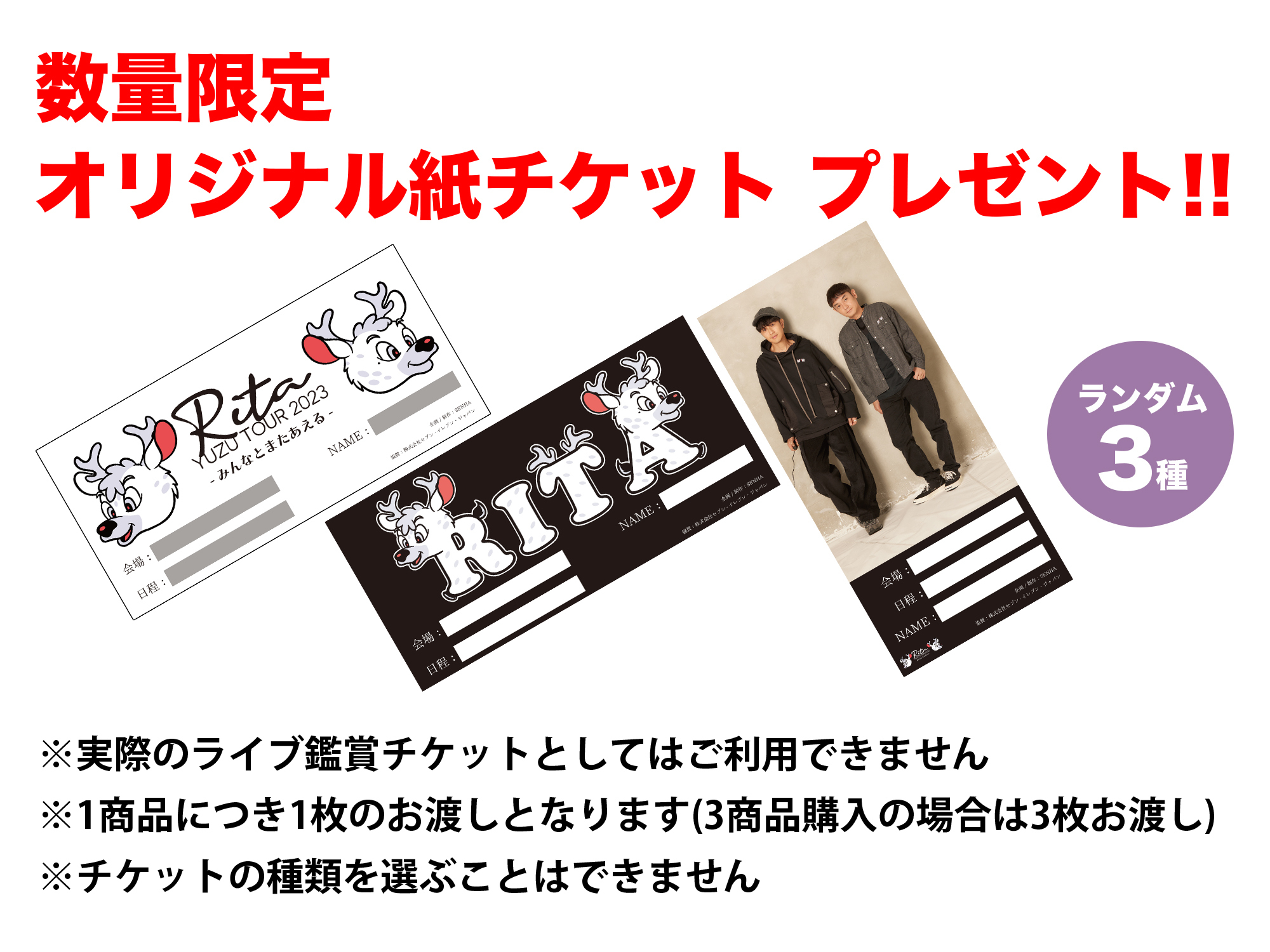 「YUZU TOUR 2023 Rita -みんなとまたあえる-」のツアー会場の物販コーナーにて、対象のCDアルバム・映像作品をご購入いただいた方に、数量限定オリジナル紙チケットをプレゼント!