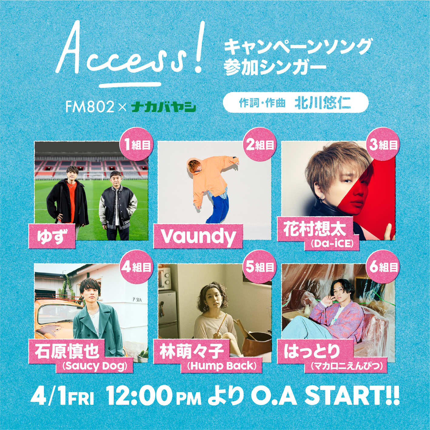 北川悠仁が作詞作曲を担当したFM802×ナカバヤシ ACCESS! キャンペーン楽曲の参加アーティスト6組が発表されました!