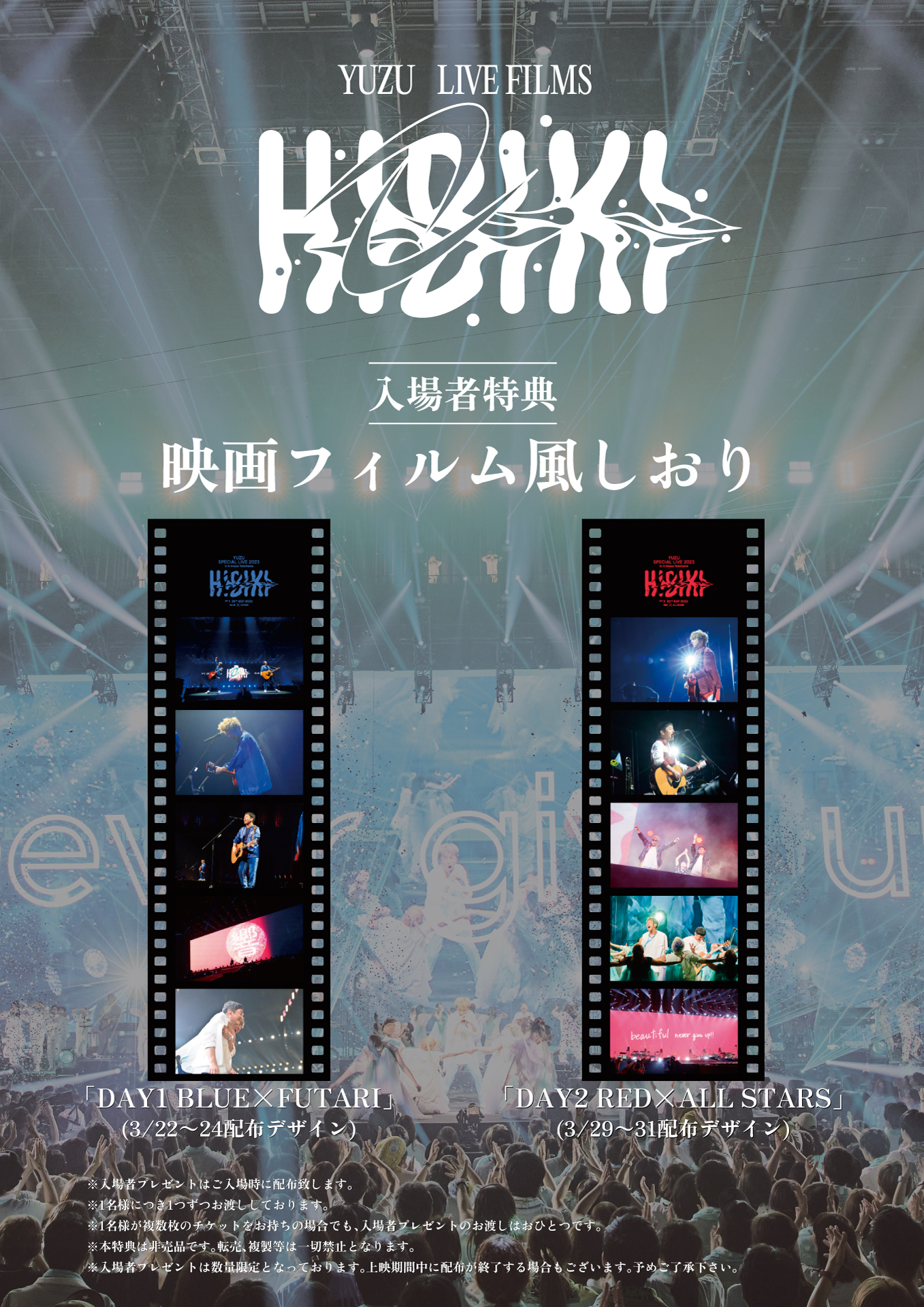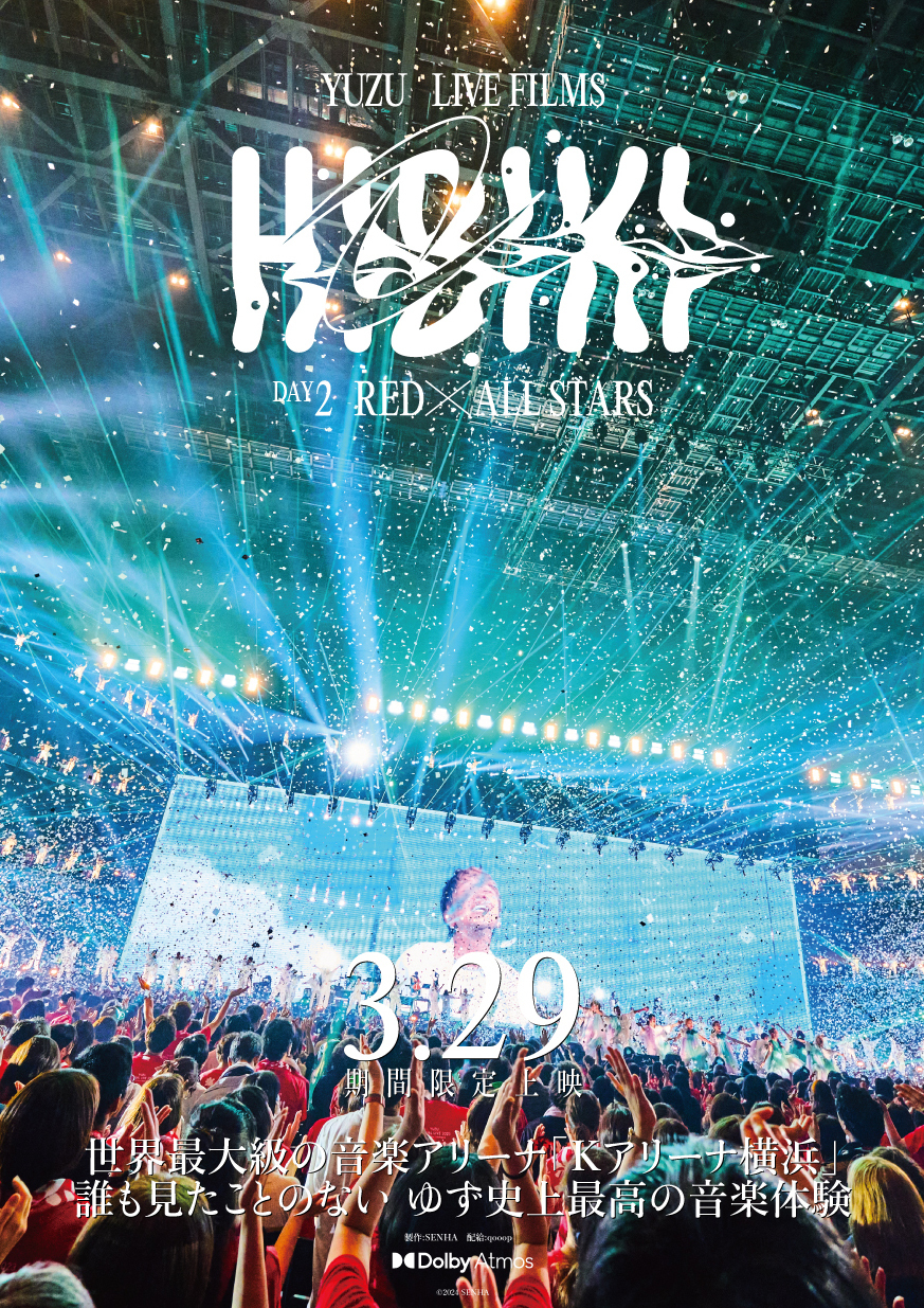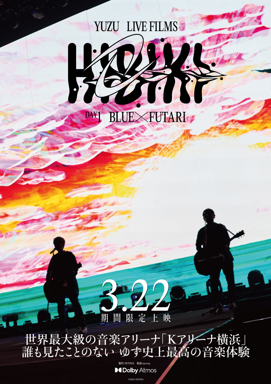 2023年秋に開催された、ゆずによる世界最大級の音楽アリーナ「Kアリーナ横浜」のこけら落とし公演。北川悠仁、岩沢厚治の二人による弾き語りスタイルで敢行した9月29日開催の「DAY1 BLUE×FUTARI」、フルバンドによる圧巻のゆずエンターテイメントを届けた9月30日開催の「DAY2 RED×ALL STARS」が、4月17日に映像作品としてリリース。その発売に先駆け、ゆずとして初となる映画館での“プレミア先行上映”が行われます。