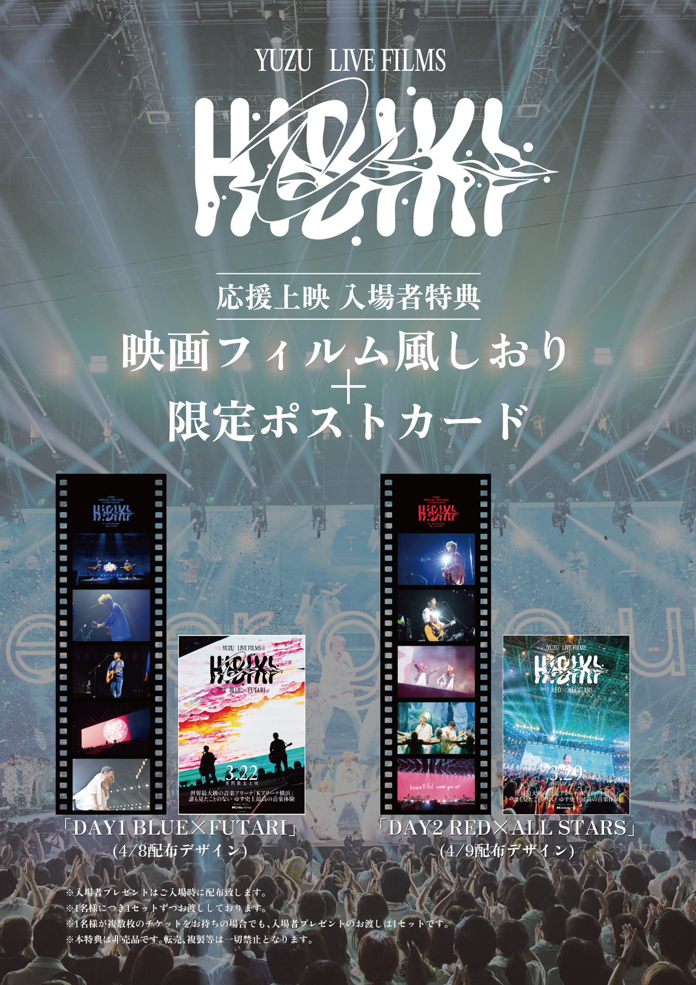 Dolby Atmosによる最高音質で上映された「ゆず LIVE FILMS HIBIKI DAY1/DAY2」。「一緒に唄いたい!」という声を頂き、それぞれ“一夜限り”の応援上映開催が決定しました!ライブ会場さながら、ぜひ盛り上がってお楽しみください!