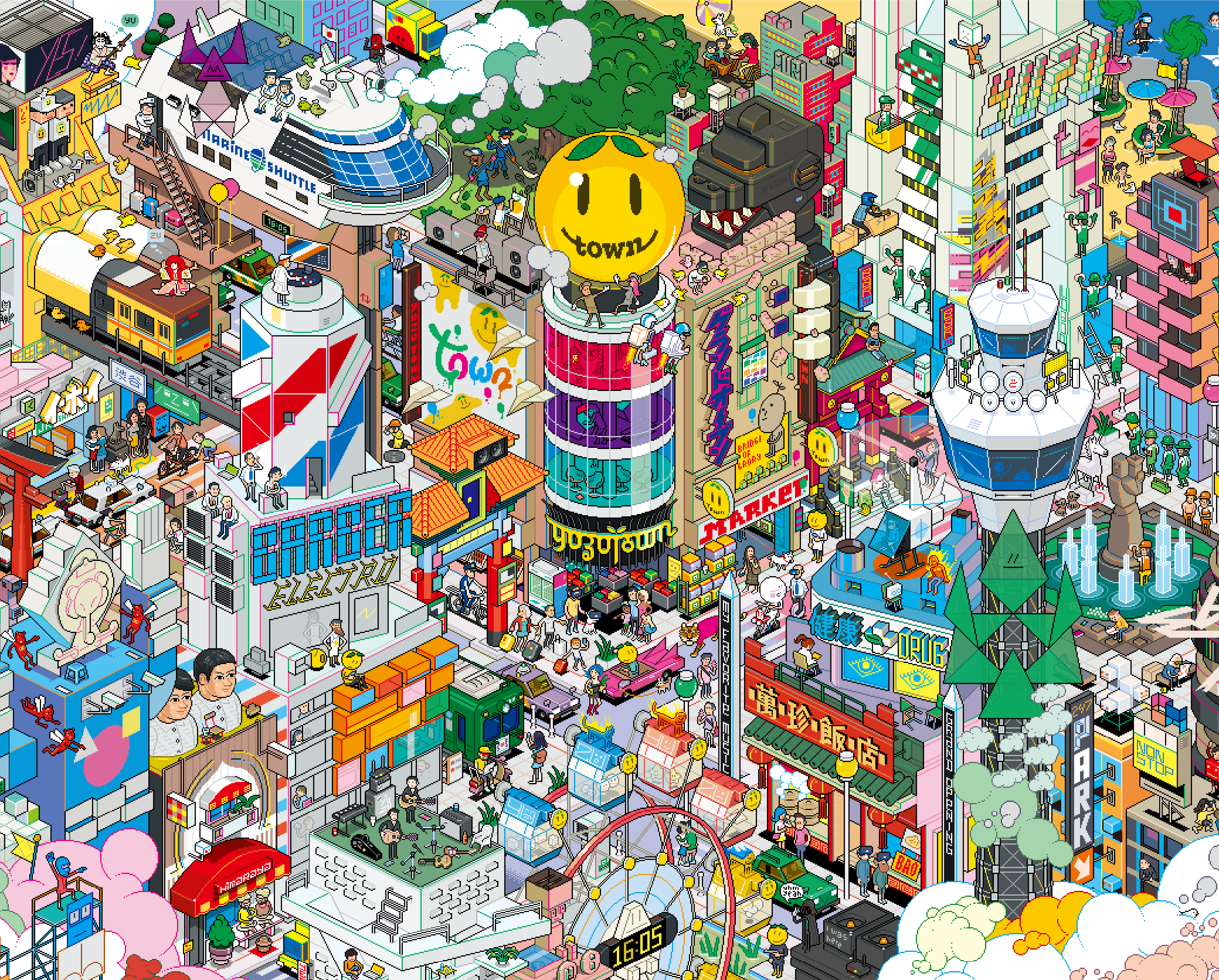 アルバムのジャケット写真にピクセルアートで描かれているのは、創造の街「YUZUTOWN」。細部にまで作り込まれたこのアートワークには、渋谷の街並み、横浜中華街、みなとみらいなど、実在する街をモチーフに組み立てながら、ユーモラスなキャラクターや造形物が1コマ単位で設置され、アルバムのコンセプトが凝縮された内容となっている