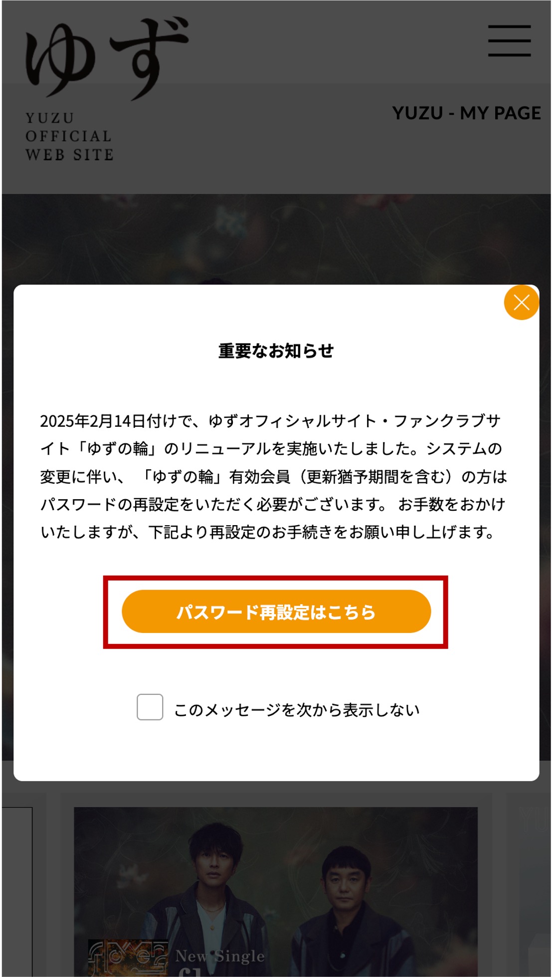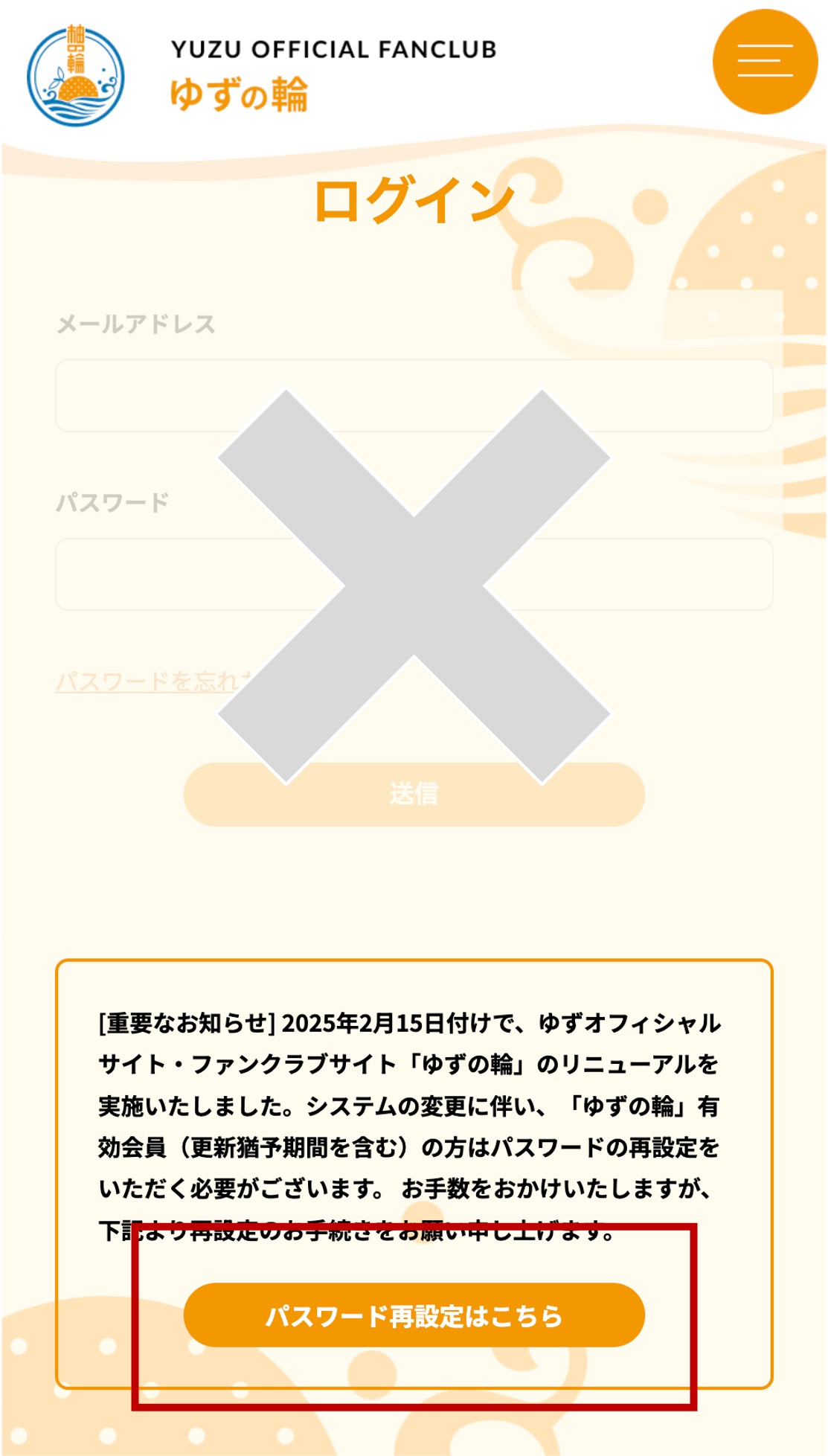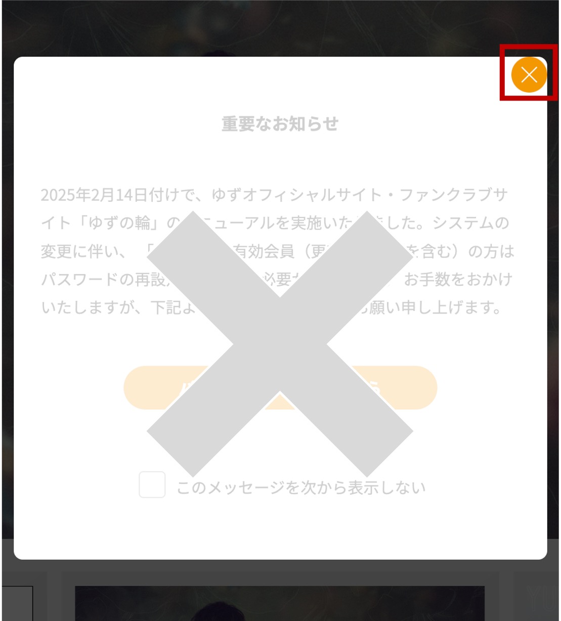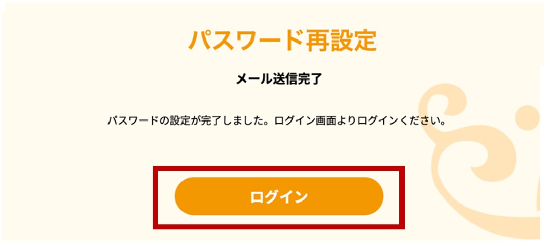 ※再度パスワード再設定のモーダルが開いてしまいましたらオレンジ色の閉じるボタンで閉じてください。