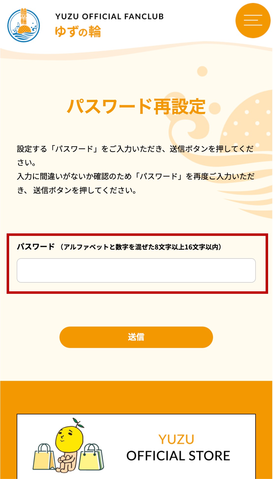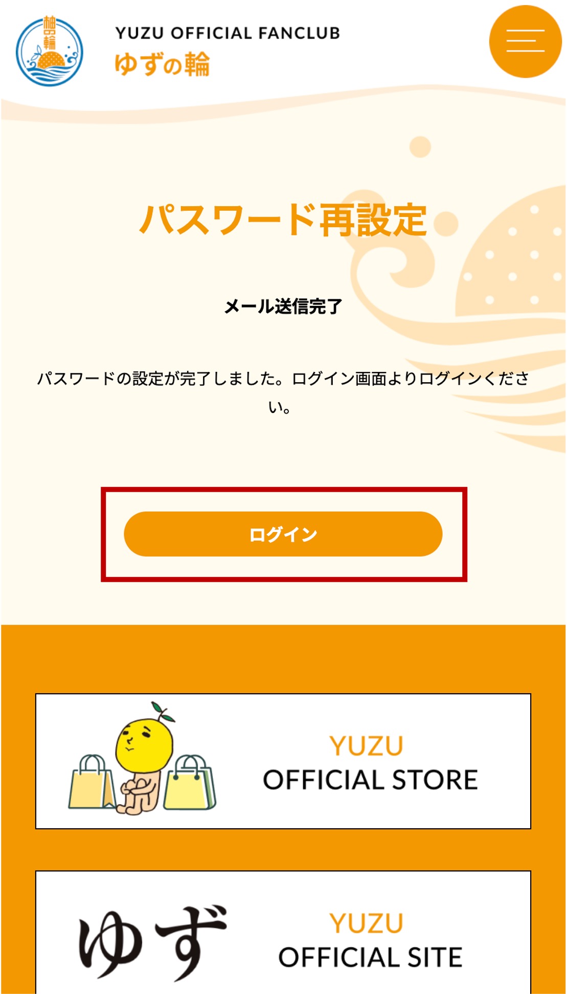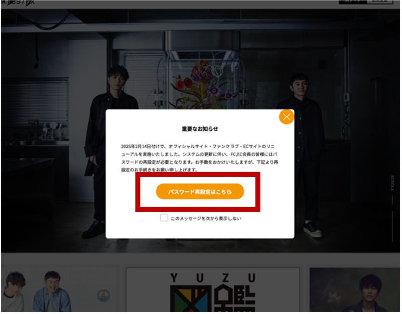 ※再度パスワード再設定のモーダルが開いてしまいましたらオレンジ色の閉じるボタンで閉じてください。