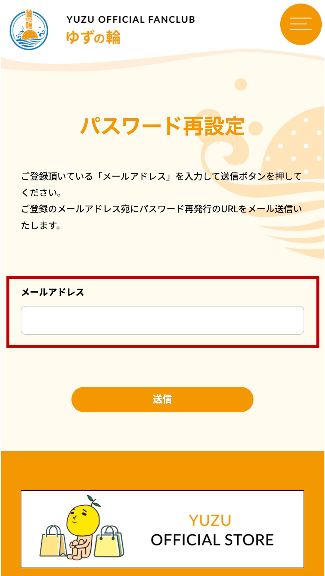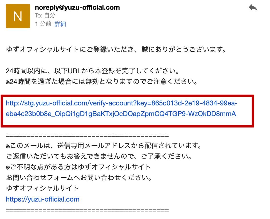 登録確認メールなどの未着回避のため、一時的に迷惑メールフィルターを解除する、または「yuzu-official.com」からのメールを受信できるように設定頂いてからお手続きを開始してください。